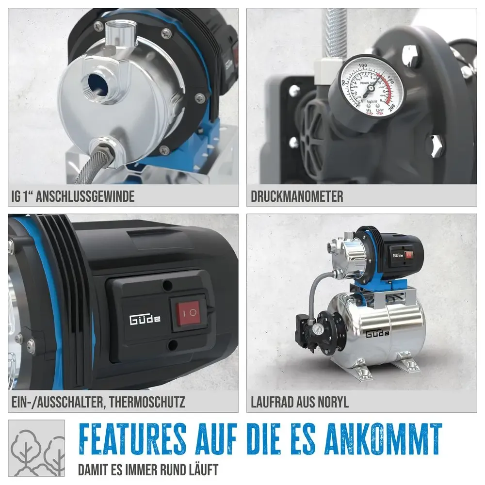 • Verpakkingsinhoud: Güde HWW 1000 ES hydrofoorpomp met geïntegreerde drukketel en manometer