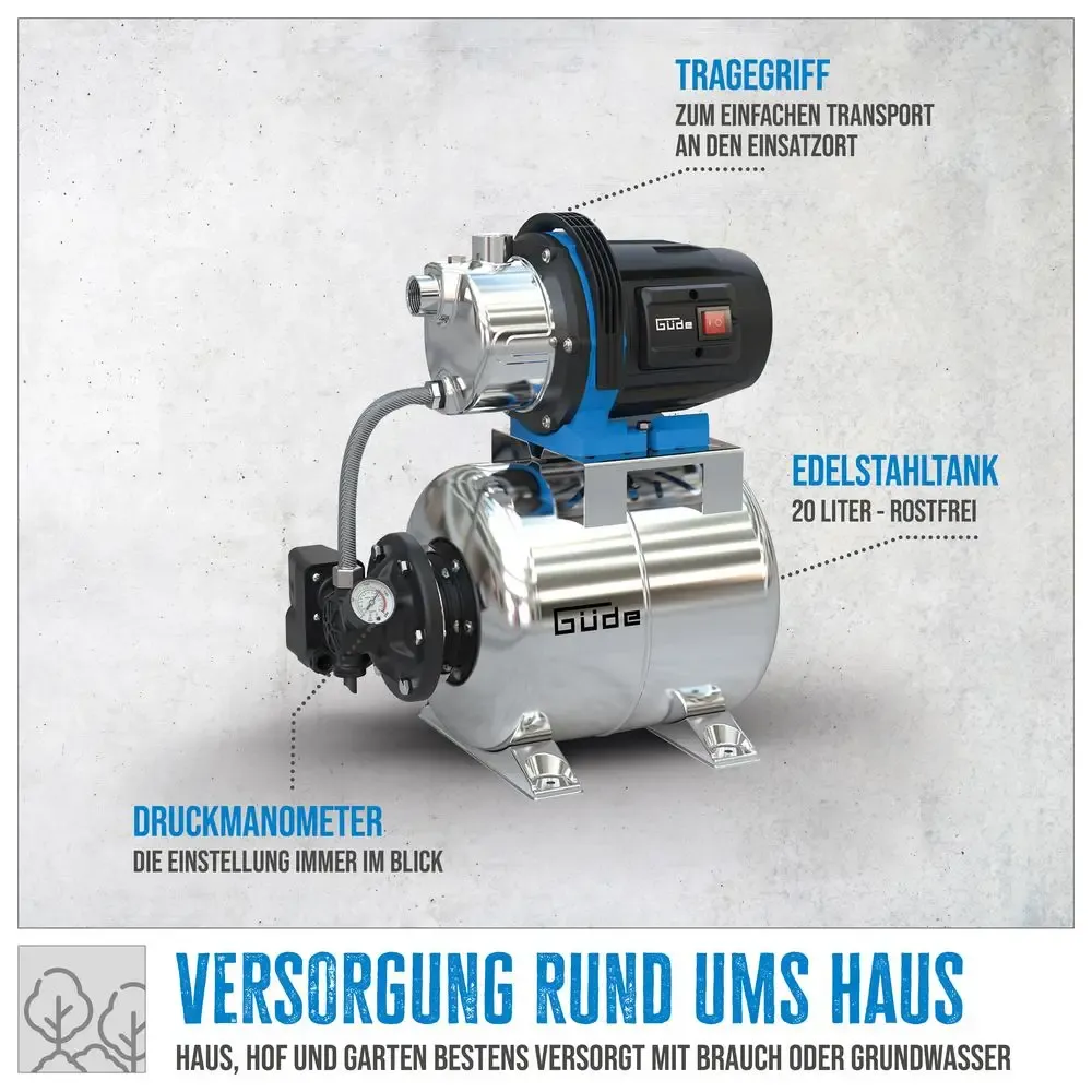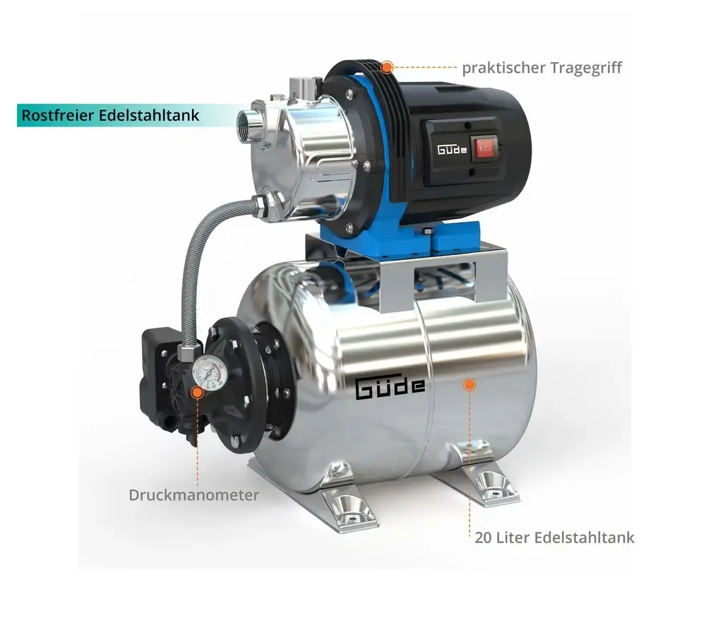 De Güde HWW 1000 ES combineert krachtige prestaties met een duurzame RVS constructie en automatische werking, waardoor het een efficiënte oplossing is voor betrouwbare watervoorziening rondom huis en tuin.