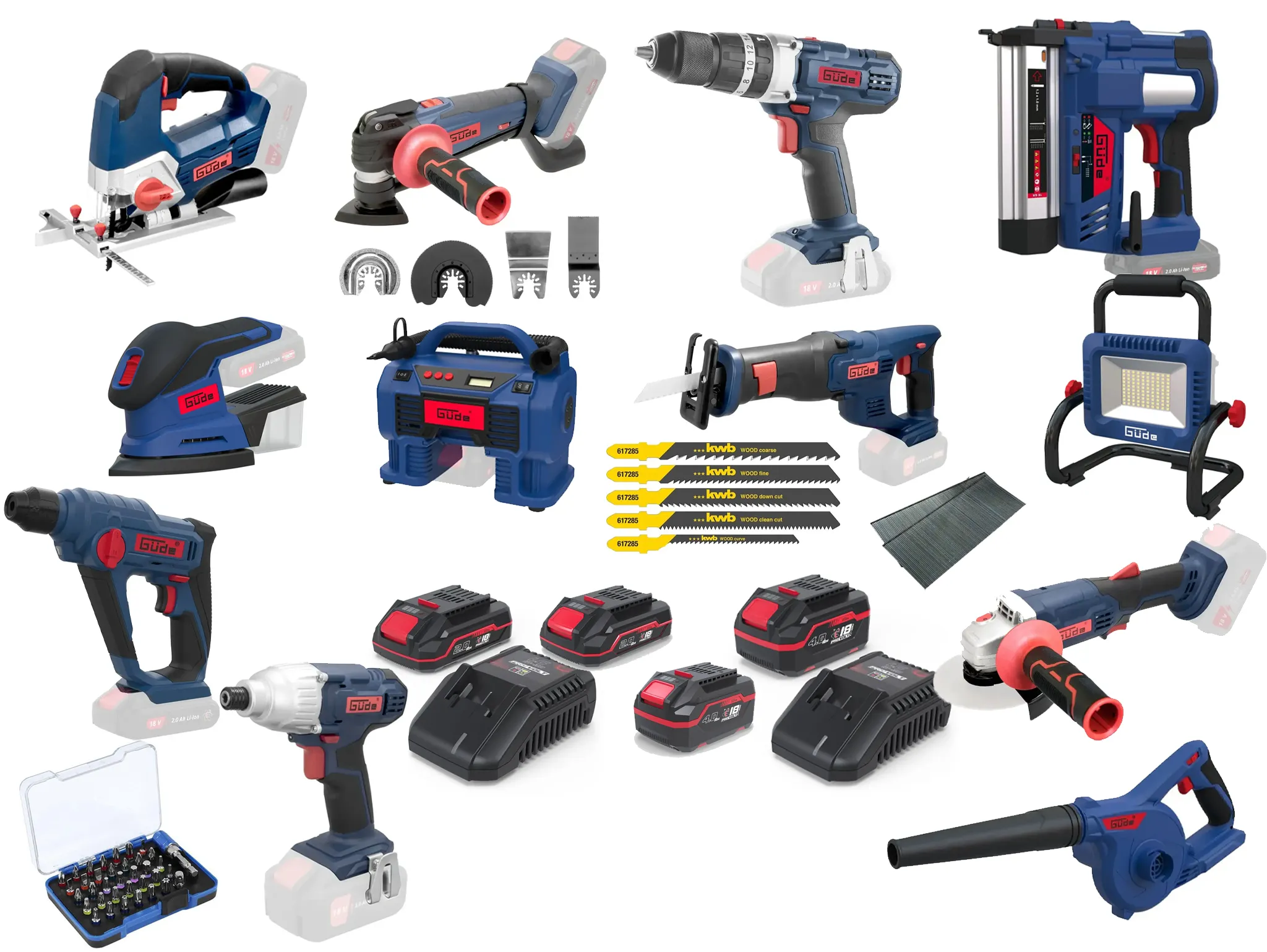 Deze combiset is opgebouwd rondom het Güde 18V E³ accusysteem, waardoor alle machines met dezelfde accu’s werken. Dit zorgt voor maximale flexibiliteit en efficiënt gebruik op elke werkplek. Dankzij de uitgebreide samenstelling is deze set geschikt voor vrijwel alle voorkomende werkzaamheden, van lichte montage tot zwaardere bouw- en renovatieklussen. De combinatie van gereedschap, accu’s en accessoires maakt dit een complete en direct inzetbare oplossing voor professioneel gebruik.