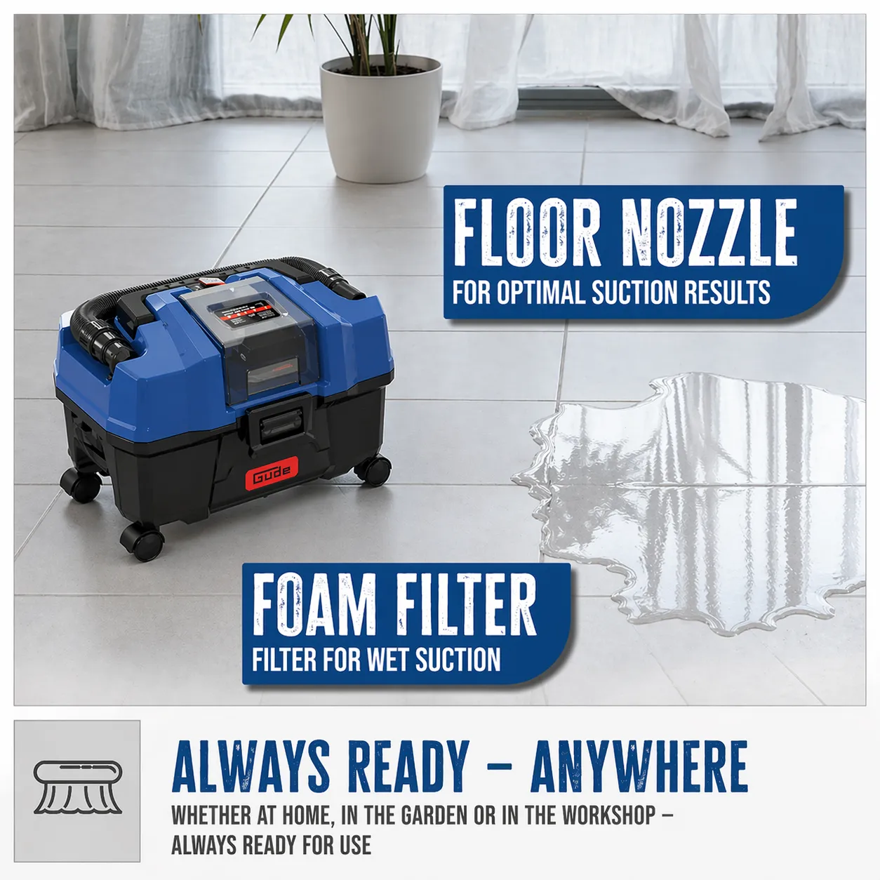 De Güde Accu Nat- en Droogzuiger NTST 18-201-05 is een veelzijdige en krachtige 3-in-1 reinigingsoplossing binnen het Güde 18V E³ accusysteem. Deze mobiele stofzuiger is geschikt voor nat- en droogzuigen én beschikt over een praktische blaasfunctie, waardoor hij breed inzetbaar is in werkplaats, garage, tuin en rondom het huis. Dankzij de draadloze werking met een 18V accu werk je volledig flexibel zonder afhankelijk te zijn van netstroom. De compacte maar robuuste 10 liter tank biedt voldoende capaciteit voor uiteenlopende schoonmaakklussen, terwijl de uittrekbare slang van 1,7 meter zorgt voor een comfortabele reikwijdte. Met de meegeleverde accessoires en filters is deze alleskunner direct klaar voor gebruik.