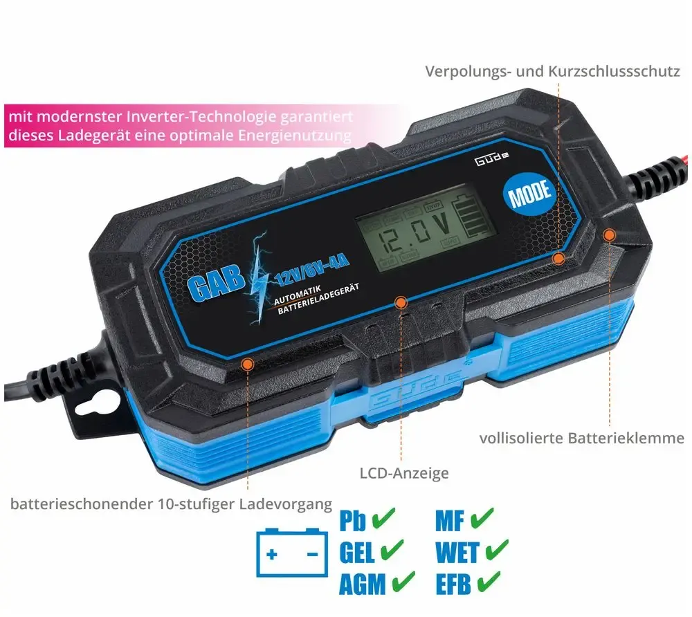 De Güde GAB 12V/6V-4A is een automatische acculader met geavanceerde inverter-technologie, ontwikkeld voor het veilig en efficiënt laden van vrijwel alle gangbare 6 V en 12 V accu’s. Dankzij de processorgestuurde laadtechnologie en het volledig automatische 10-staps laadproces wordt de accu optimaal geladen en beschermd. Deze acculader is geschikt voor gebruik in voertuigen, werkplaatsen en garages en kan ook direct worden aangesloten op een accu die nog in het voertuig gemonteerd zit.