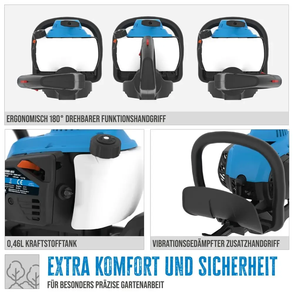 De Güde GMH 603 benzine heggenschaar is een krachtige en robuuste machine voor het efficiënt snoeien van hagen, struiken en dichte begroeiing. Deze professionele heggenschaar is uitgerust met een sterke 2-takt motor van 26 cm³, waardoor ook dikkere takken tot 27 mm probleemloos worden gesnoeid. Dankzij de royale zwaardlengte van 770 mmen een snijlengte van 615 mm kunnen ook grotere hagen snel en gelijkmatig worden onderhouden. Het doordachte ontwerp met 3-punts anti-vibratiesysteem en een extra gedempte handgreep zorgt voor comfortabel werken, zelfs bij langdurige snoeiwerkzaamheden. De 180° draaibare bedieningsgreep maakt het mogelijk om zowel horizontaal als verticaal nauwkeurig te werken, wat de heggenschaar bijzonder veelzijdig maakt voor tuinonderhoud rondom woning, erf en terrein.