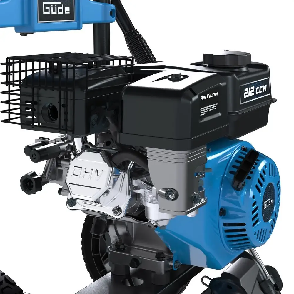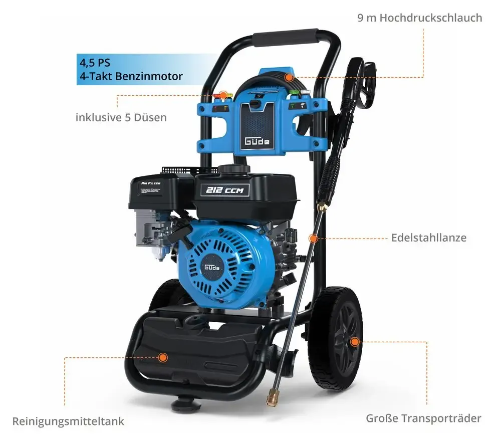 De Güde Benzine 250 hogedrukreiniger is ontworpen voor veeleisende schoonmaaktaken rondom huis, erf, werkplaats en bouwterrein. Dankzij de krachtige 4-takt benzinemotor met 5,9 pk werkt deze reiniger volledig onafhankelijk van netstroom – ideaal voor plekken zonder elektriciteitsaansluiting. Met een werkdruk van 234 bar en een wateropbrengst van 590 liter per uur verwijdert hij moeiteloos hardnekkig vuil van bijvoorbeeld bestrating, gevels, voertuigen en machines. De robuuste constructie, het stevige stalen frame en de grote wielen zorgen voor een stabiele werking, terwijl de 9 meter lange hogedrukslang veel bewegingsvrijheid biedt. Een geïntegreerde reinigingsmiddeltank maakt het mogelijk om ook met zeep of shampoo te werken voor een nog schoner resultaat.