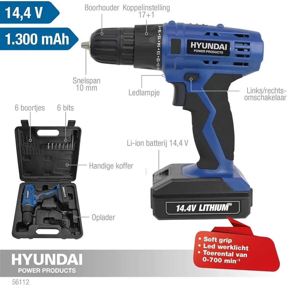 De Hyundai accuboormachine 14,4V is een krachtige en veelzijdige schroefboormachine voor iedere klusser. Deze compacte machine is uitgerust met een 14,4V Li-ion accu van 1,3 Ah en is geschikt voor boren in hout, staal, kunststof en gips, evenals voor het in- en uitschroeven van diverse schroeven. Dankzij de 17+1 koppelinstellingen werk je nauwkeurig en gecontroleerd. De softgrip handgreep en geïntegreerde LED-werklamp zorgen voor comfort en goed zicht tijdens het werken. Geleverd in een complete set met accessoires en kunststof koffer.