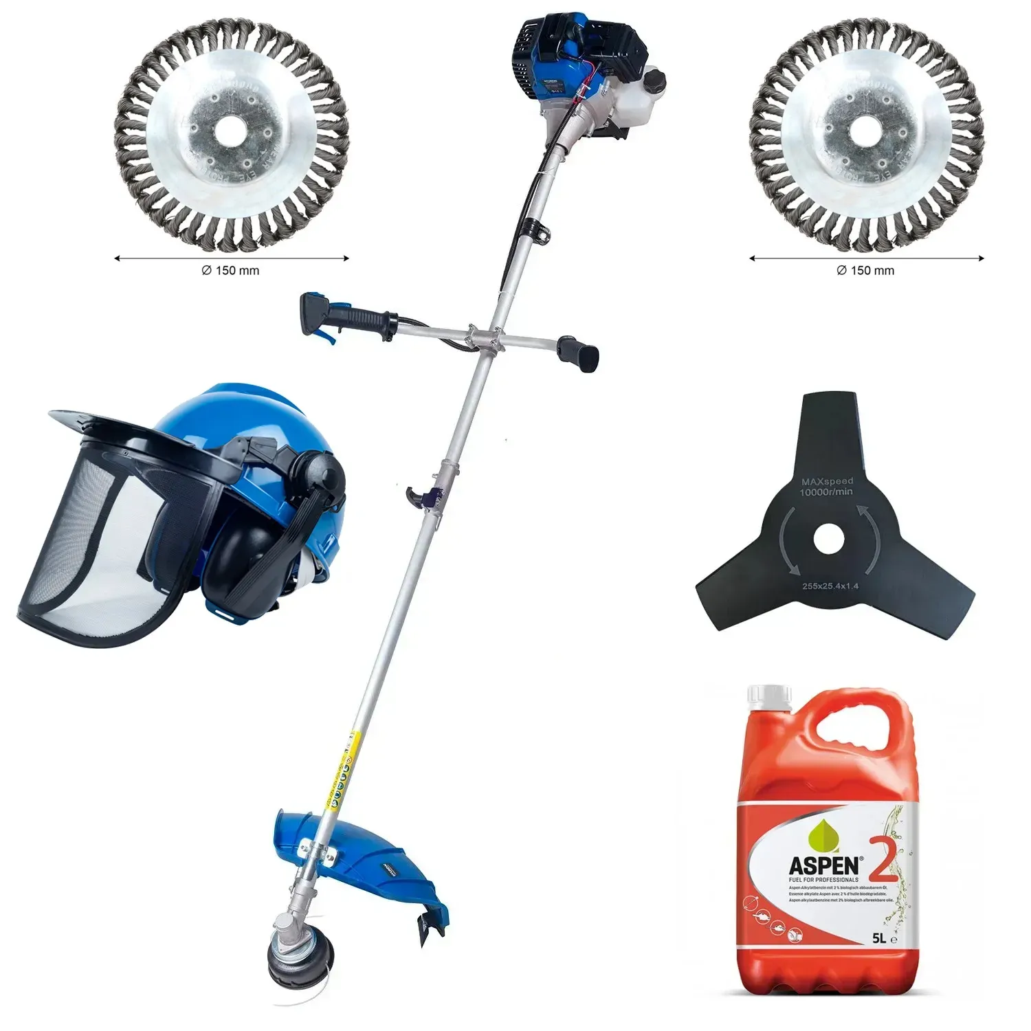 De machine wordt geleverd met een hoogwaardige “tap&go” tweesnarige nylon snijkop voor gebruik als grastrimmer en een metalen snijmes voor gebruik als een motorzeis, met 3 tanden. Het wisselen tussen de metalen bladen naar de 2-snarige kop is bijzonder eenvoudig en de as vergrendelt eenvoudig op zijn plaats. Dankzij een grote snijbreedte van 255 mm tot 440 mm kunt u snel grote stukken maaien. Het lage gewicht van slechts 8 kg, in combinatie met het dubbele schouderharnas, zorgt ervoor dat u dit apparaat voor lange tijd kunt gebruiken zonder spanning op uw rug, schouders of armen. De lengte van de bosmaaier is 160cm.