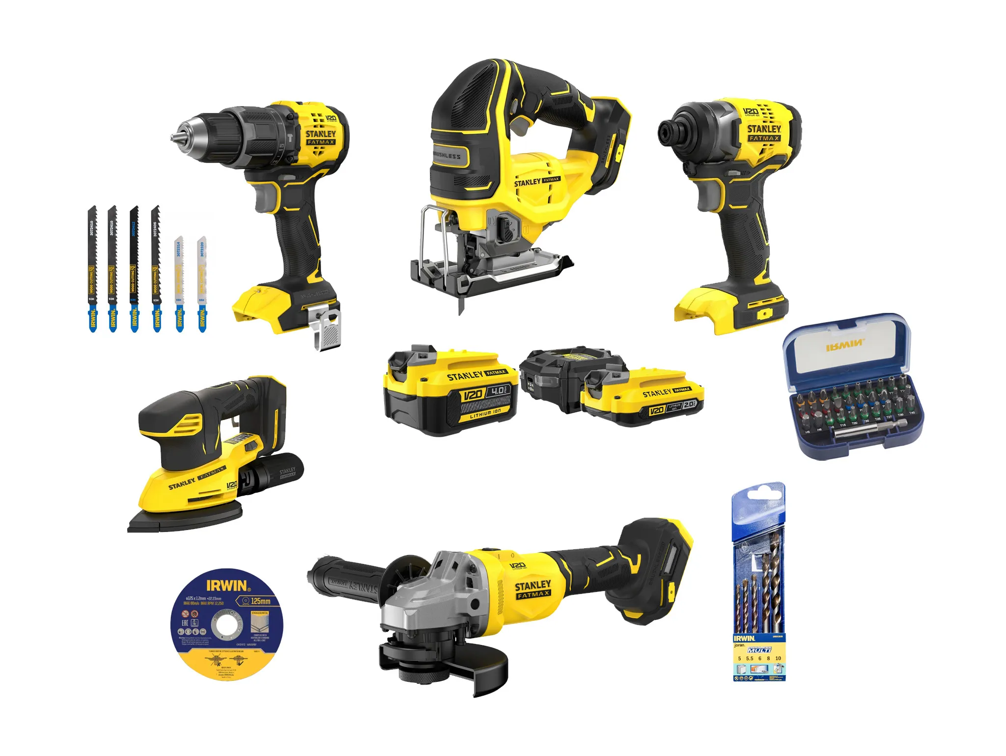 De machines maken deel uit van het Stanley FATMAX V20 18V accusysteem waarbij één accu compatibel is met alle Stanley V20 machines en tuinapparatuur. Verpakkingsinhoud: vijf Stanley V20 machines, 2 accu’s, lader en diverse accessoires zoals bitset, boren, slijpschijven en decoupeerzaagbladen. Deze set biedt een complete oplossing voor uiteenlopende werkzaamheden zoals montage, renovatie, slijpwerk, houtbewerking en metaalbewerking.