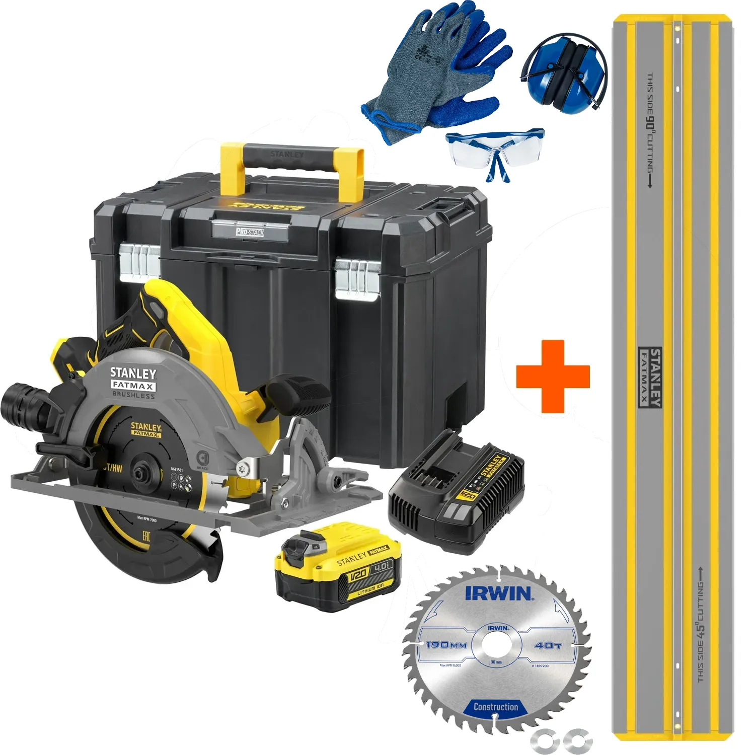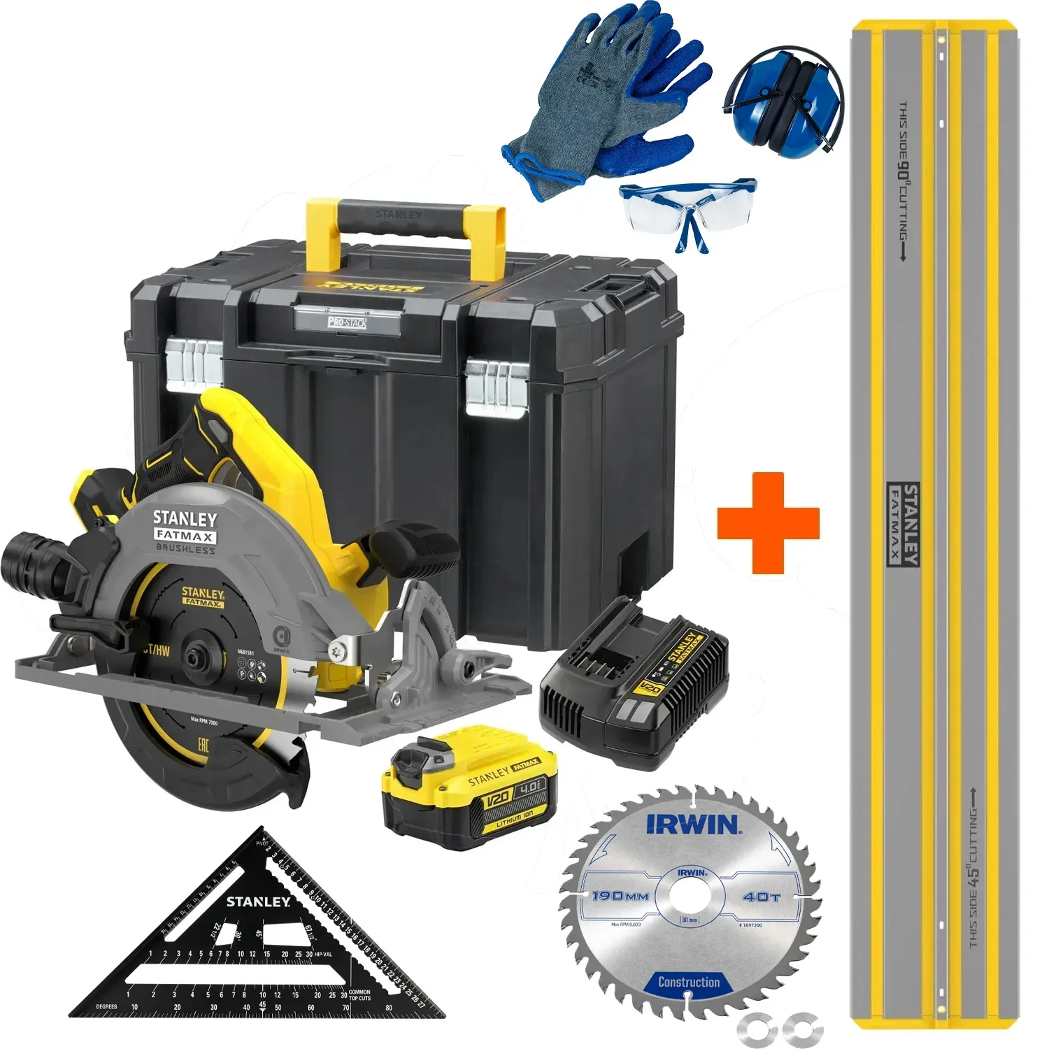 Deze complete set wordt geleverd met een Stanley STST140 geleiderail van 140 cm, een 18V 4,0Ah Lithium-ion accu, een 2A oplader, een PROSTACK-koffer, een 40-tands zaagblad + 24Tands voorgemonteerd én een PBM-set voor veilig werken.